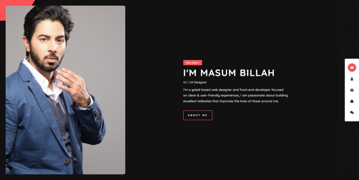 【黑色个人简介单页模板】这是一款简约而现代的网页模板,专为个人量身打造。模板以深色背景为主调,右侧精心布置了一张人物侧面照,既展现了专业形象,又透露出深思的氛围。网页左上角镶嵌的圆形标志,犹如网站的独特徽章,彰显着品牌的身份与特色。左侧排列的三个社交媒体图标,如同通往外界的桥梁,方便用户轻松连接至各大社交平台,增强了网站的互动性与便捷性。