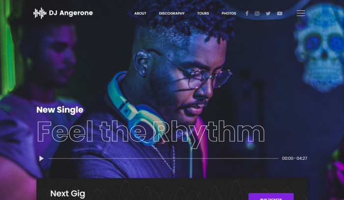 【DJ音乐人专属网站模板】匠心独运,为音乐人量身打造!此模板深度融合DJ的独特风格与辉煌成就,首页以震撼视觉的音乐人照片及最新单曲为核心亮点,采用现代时尚且充满活力的设计理念,瞬间捕获访客目光。页面布局井然有序,高质量图片与简洁明了的排版相得益彰,共同营造出激情四溢的音乐盛宴氛围。