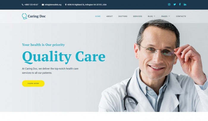 【医学专家健康诊所网站模板】设计精致,巧妙采用蓝色为主色调,营造出既专业又温馨舒适的就医环境。页面顶部,英雄区域以一幅引人入胜的大图搭配精炼文字,直观而有力地传达出诊所对高品质医疗服务的坚定承诺。导航菜单设计清晰明了,使患者能够轻松快捷地找到咨询、诊断、治疗等关键服务板块。