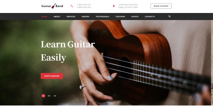 【吉他学习圣地单页模板】——吉他爱好者的理想学习平台,呈现出现代且专业的吉他教学页面。页面顶端以“轻松学习吉他”为醒目标语,直接传递出学习吉他的便捷与愉悦。导航栏设计清晰,内容全面,从详尽的课程介绍到便捷的联系方式,一应俱全,让用户能够迅速找到所需信息。