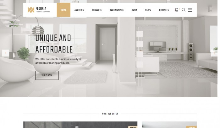 【现代简约-家居建筑全能模板】专为家居装修、地板以及建筑和室内设计等广泛领域量身打造,完美融合了现代简约的设计风格。顶部导航栏设计清晰直观,使用户能够轻松快捷地找到所需信息。同时,页面上的标语醒目有力,充分展现了品牌的专业性和可信赖形象。
